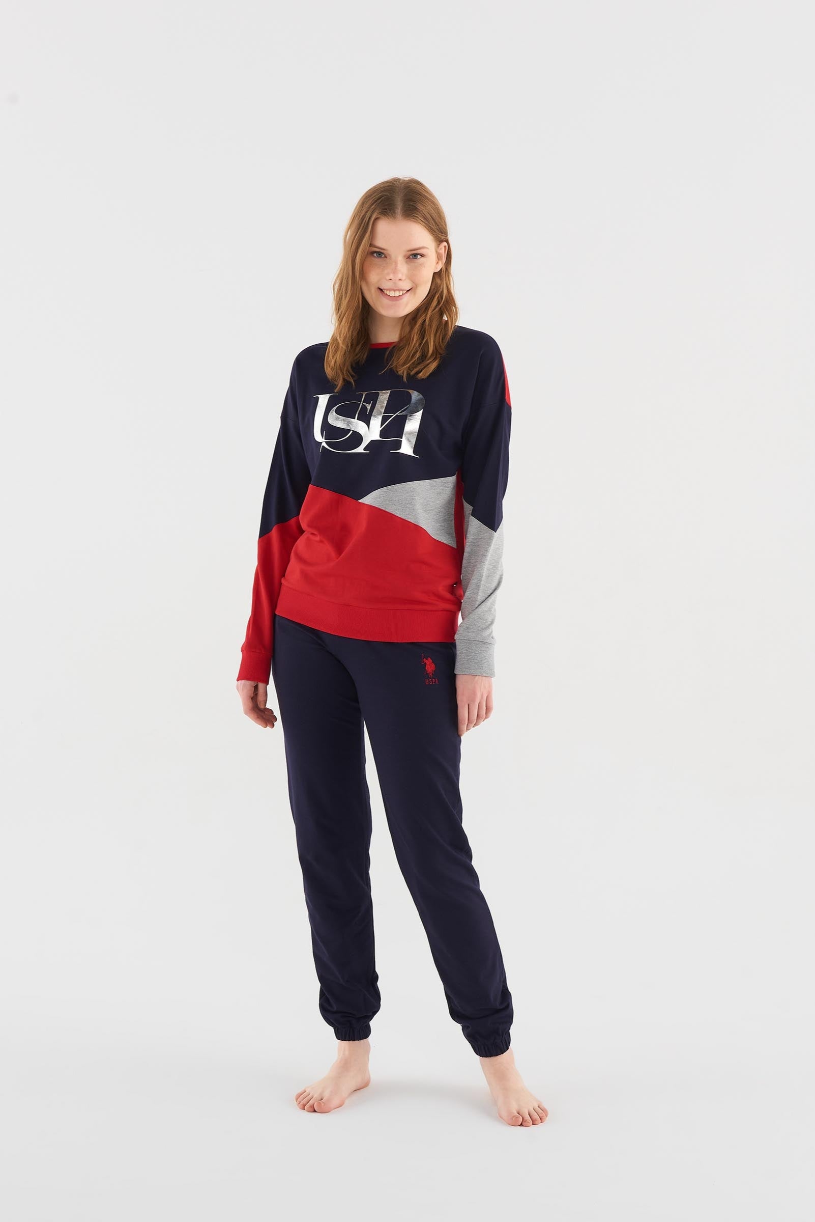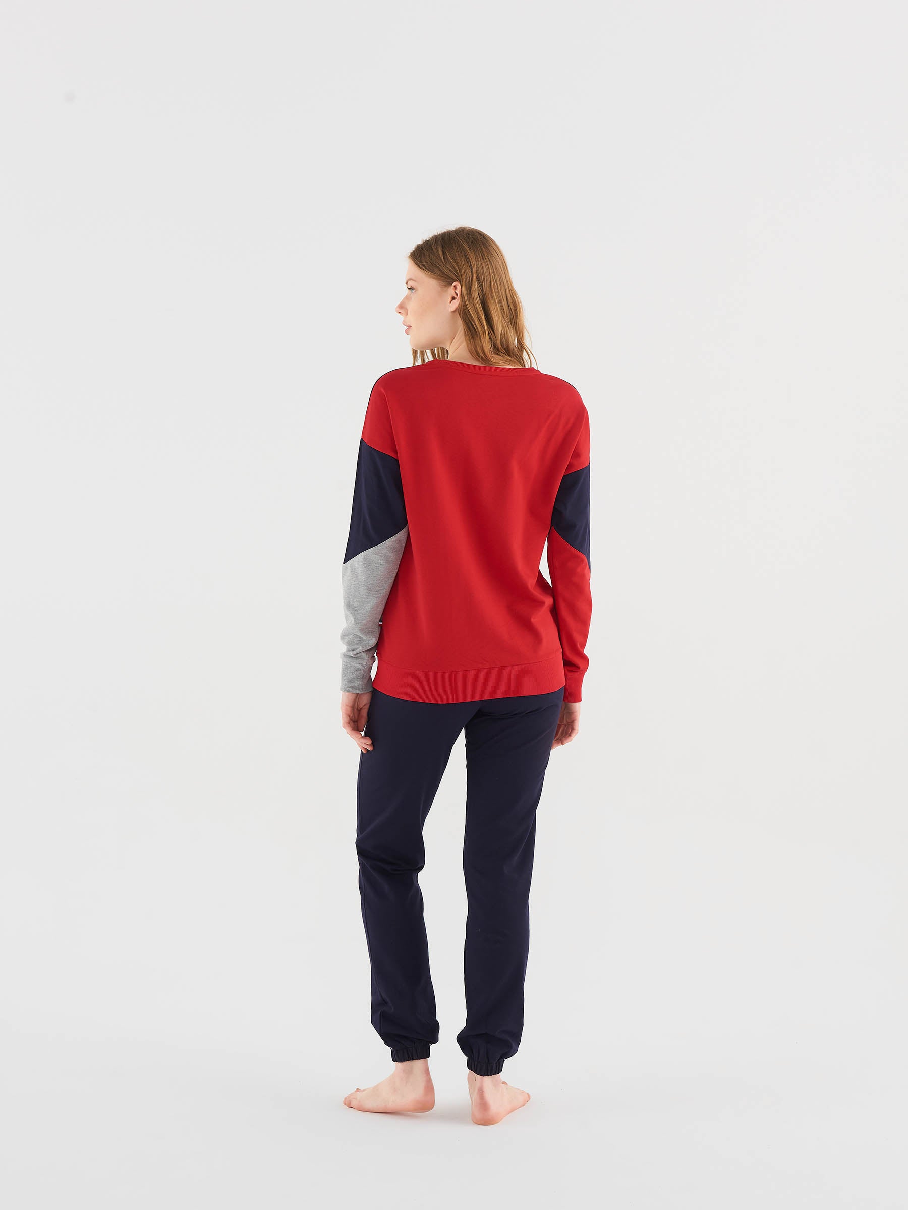 Udobna ženska pidžama u sportskom stilu kombinuje tamnoplavu, crvenu i sivu boju, stvarajući ležerni, ali atraktivni izgled. Karakteriše je opušteni kroj koji obećava maksimalnu udobnost tokom nošenja, dok je dizajn upotpunjen velikim slovima na gornjem dijelu koji dodaju dozu dinamičnosti. Pidžama je izrađena od mekog i kvalitetnog materijala koji je prijatan na dodir, osiguravajući udobnost tokom cijele noći. Donji dio ima praktične rebraste manžetne koje sprječavaju klizanje nogavica, a džep na prednjoj strani gornjeg dijela dodaje element funkcionalnosti. Ovaj komplet pidžame je savršen izbor za dame koje traže spoj udobnosti i casual stila za opuštanje kod kuće.