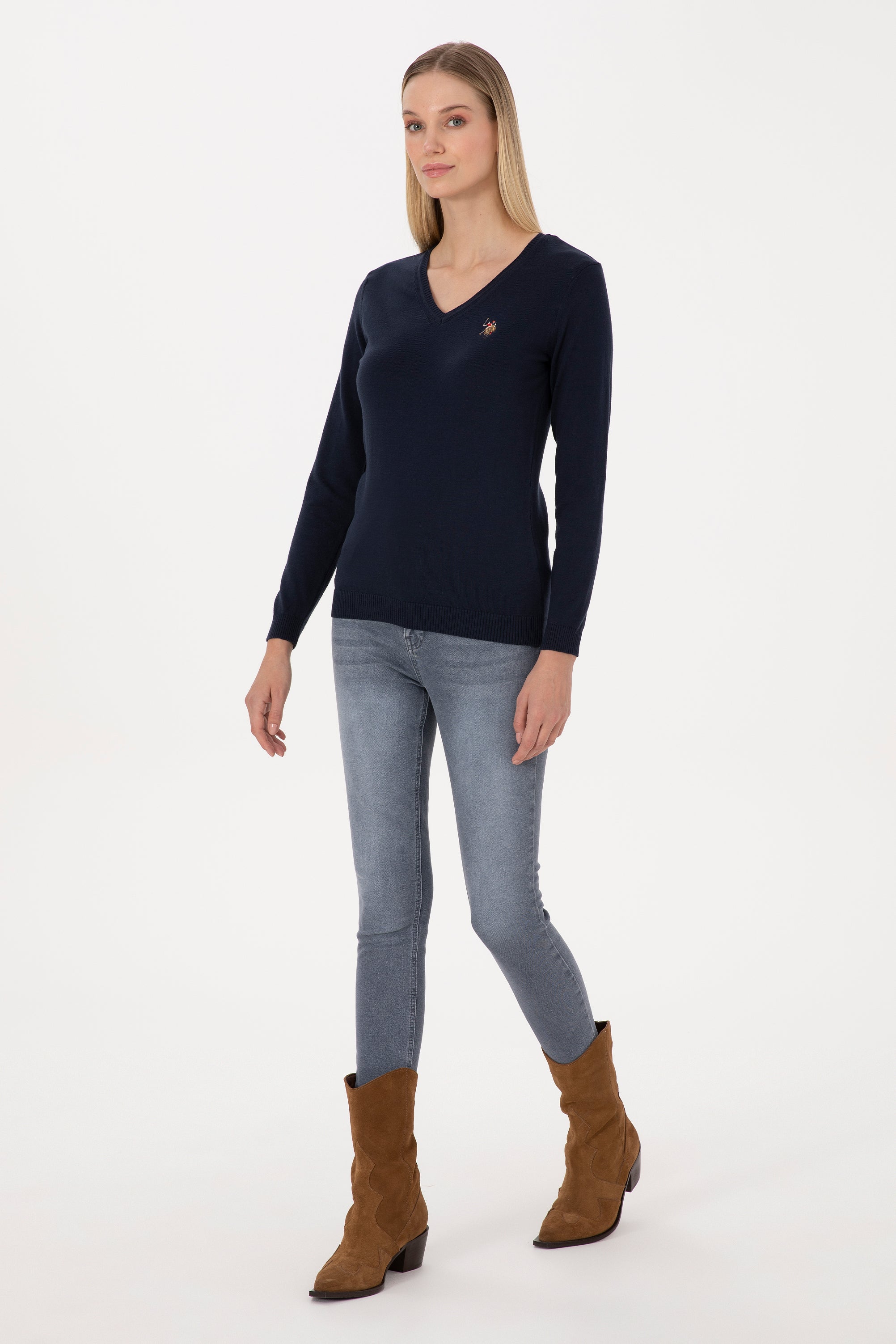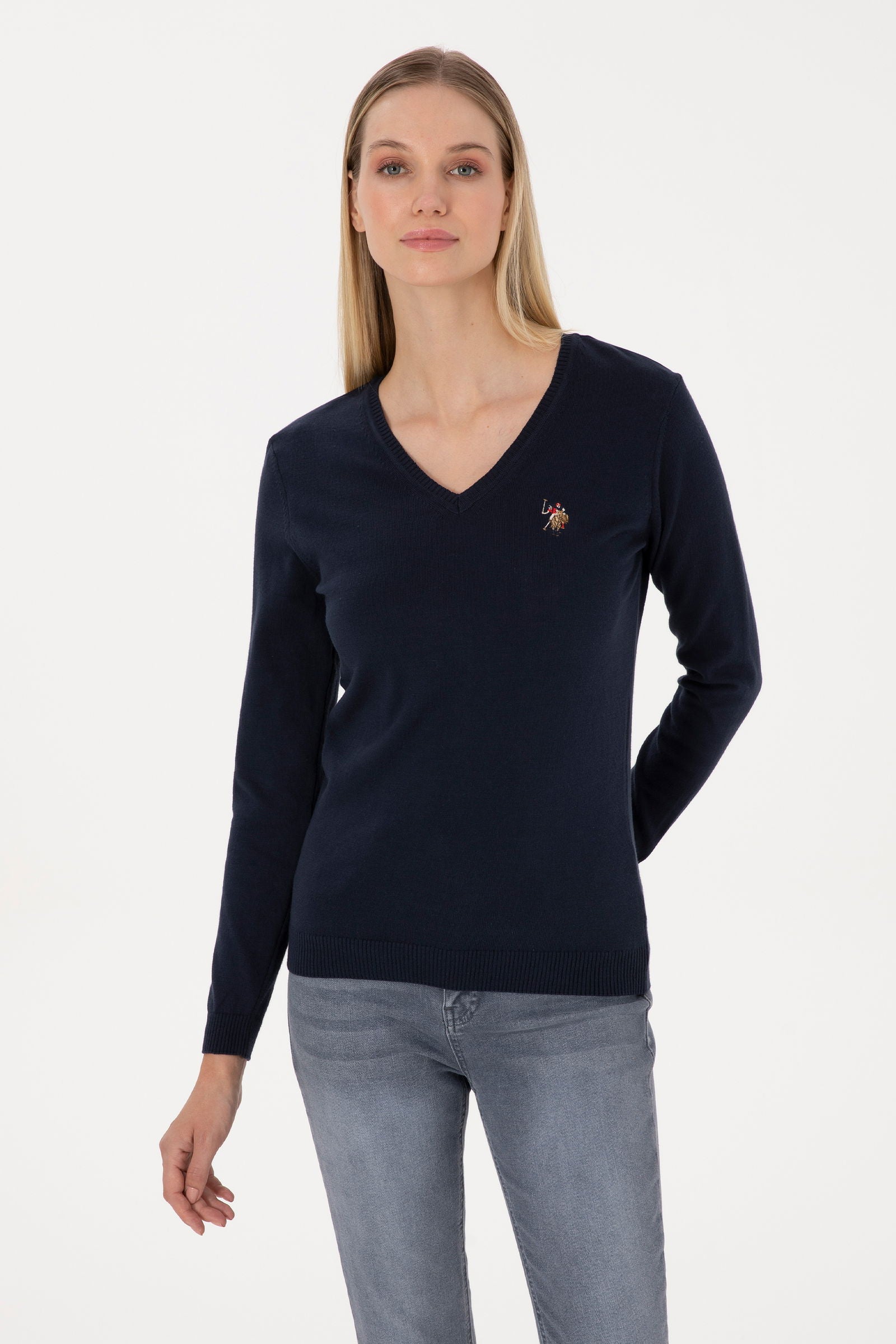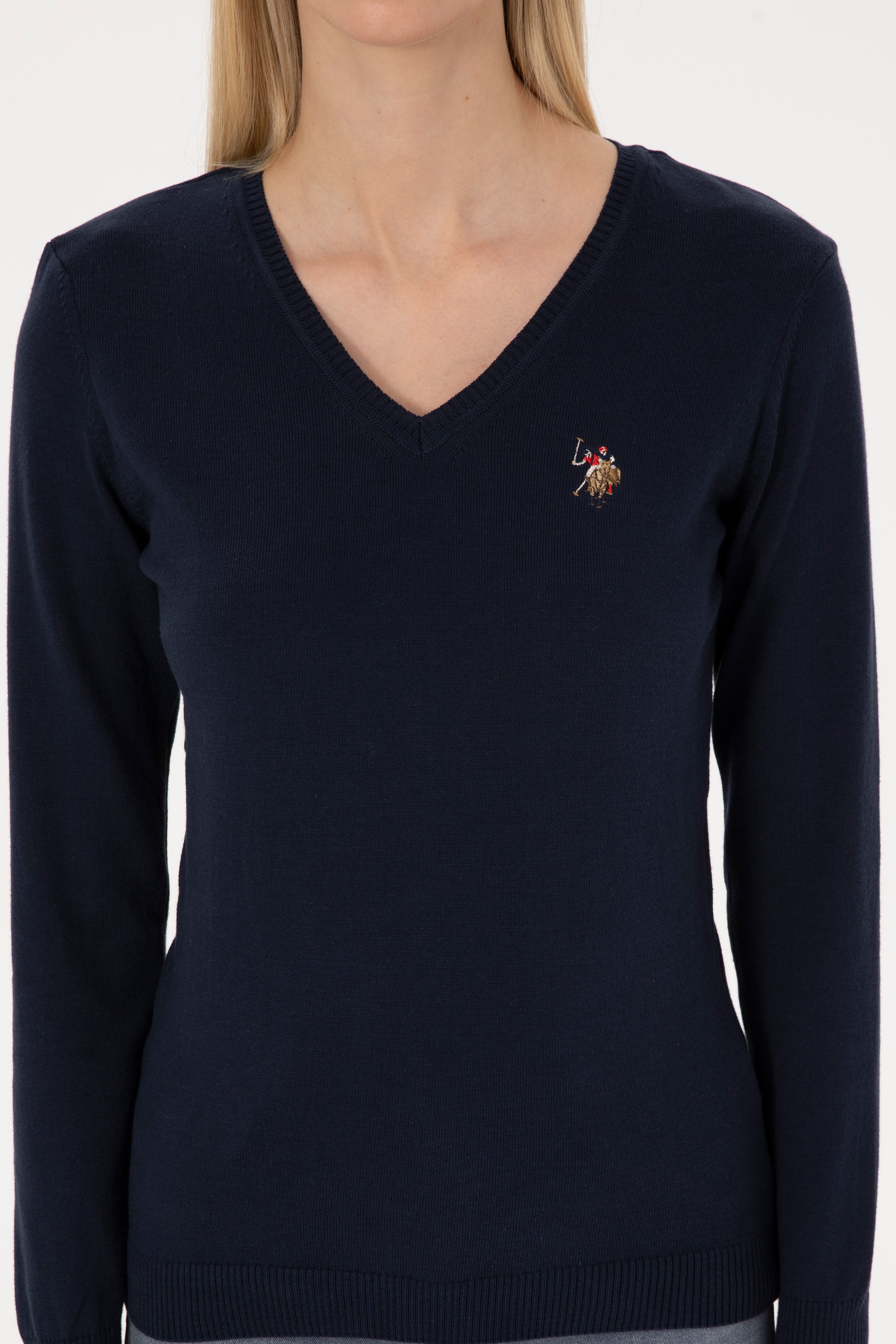Ženski Teget Plavi Džemper Na V Izrez
